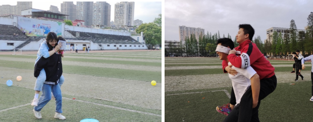 活动接近尾声,进行最后一个令人期待的游戏4——瞎子指路。两队队员随机搭配,一人扮演瞎子,一人扮演瘸子。通过设置障碍和踩气球,采取背人接力的方式进行两轮游戏,最终“打当当”队赢得两局,积二十分获得最终胜利并颁发奖品。