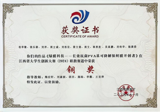 近日,由我院老师参与指导的《绿膜科技--长效抗菌PVA基可降解保鲜膜开创者》在江西省大学生创新大赛(2024)职教赛道中荣获铜奖!