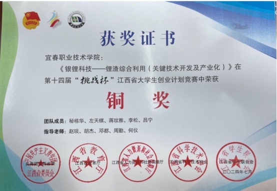 近日,由我院老师指导学生参加的《银锂科技--锂渣综合利用(关键技术开发及产业化)》在第十四届“挑战杯”江西省大学生创业计划竞赛中荣获铜奖!