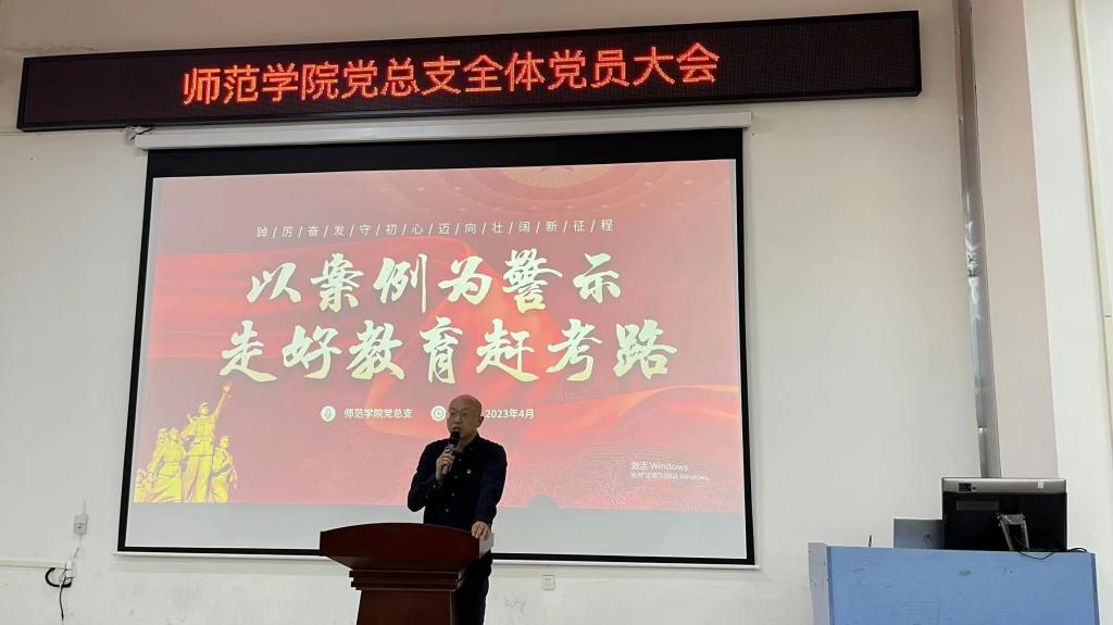 本站讯(师范学院党总支 袁旭)为教育引导党员干部时刻保持“赶考”的清醒,筑牢党员干部思想防线,4月11日,师范学院党总支在正心楼A108开展警示教育活动,此活动由院长肖勇主持。