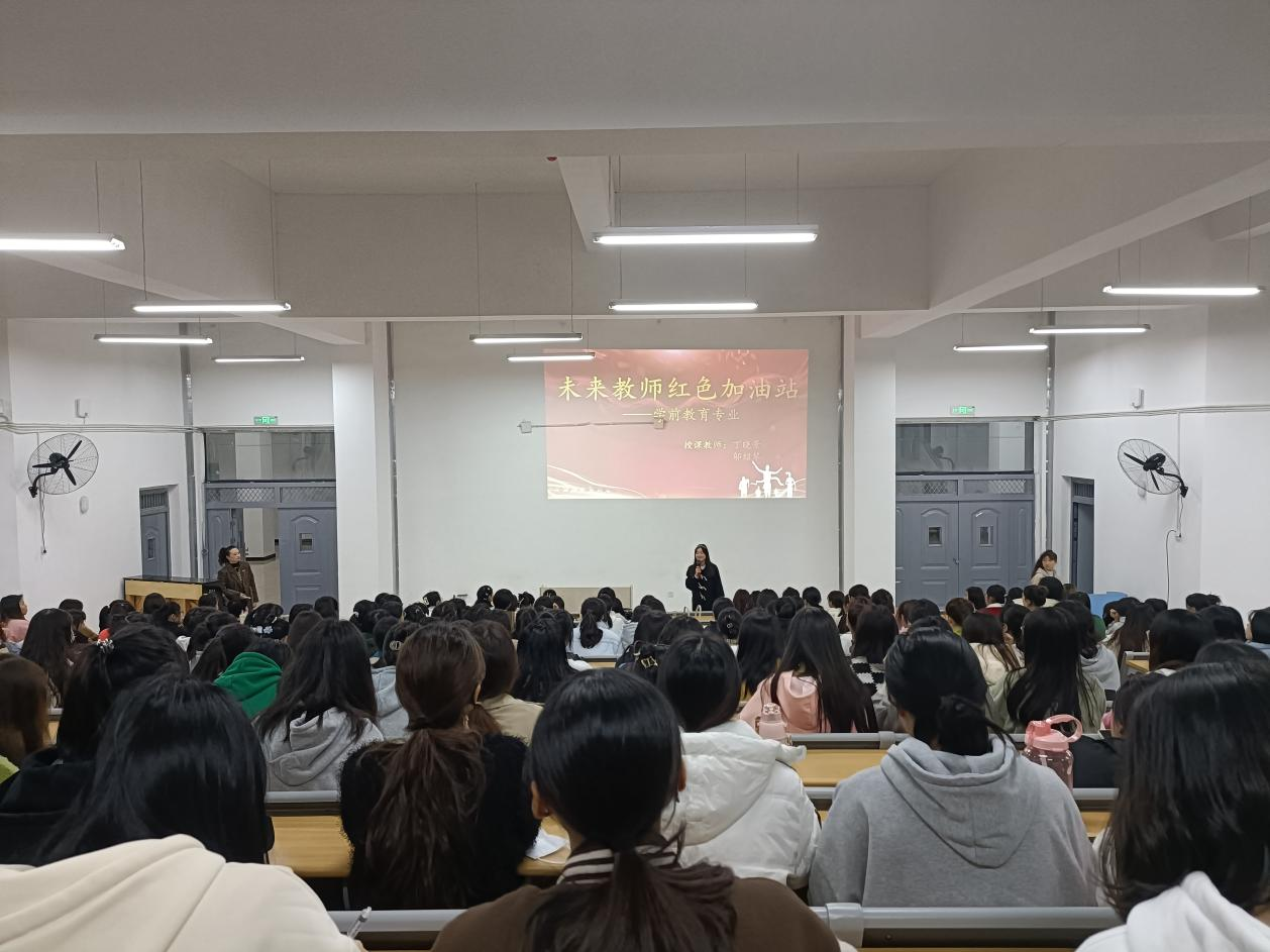 本站讯(师范学院周思昀 学生记者杨垚 聂文婷)为进一步加强学前教育专业学生对国家幼儿园教师资格考试面试的认识,掌握面试的方法和技巧,11月23日晚,师范学院邀请丁晓景、邬绍琴两位老师为300余名学前教育专业学生授课,开展未来教师红色加油站教资面试培训活动。