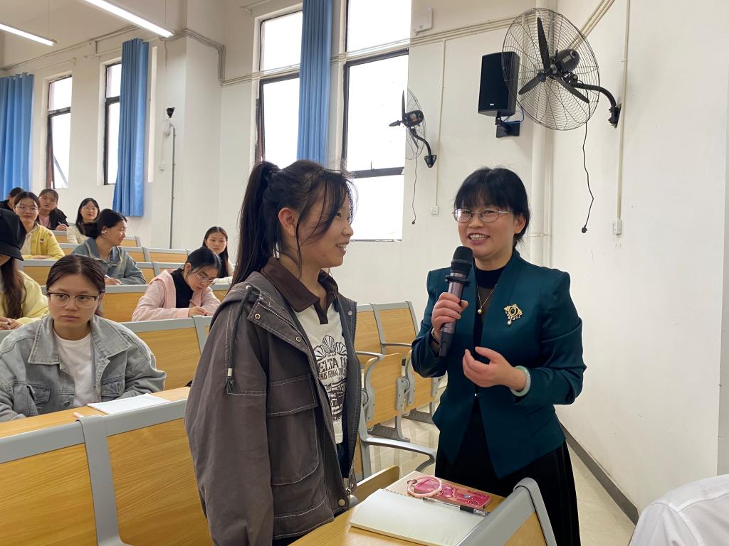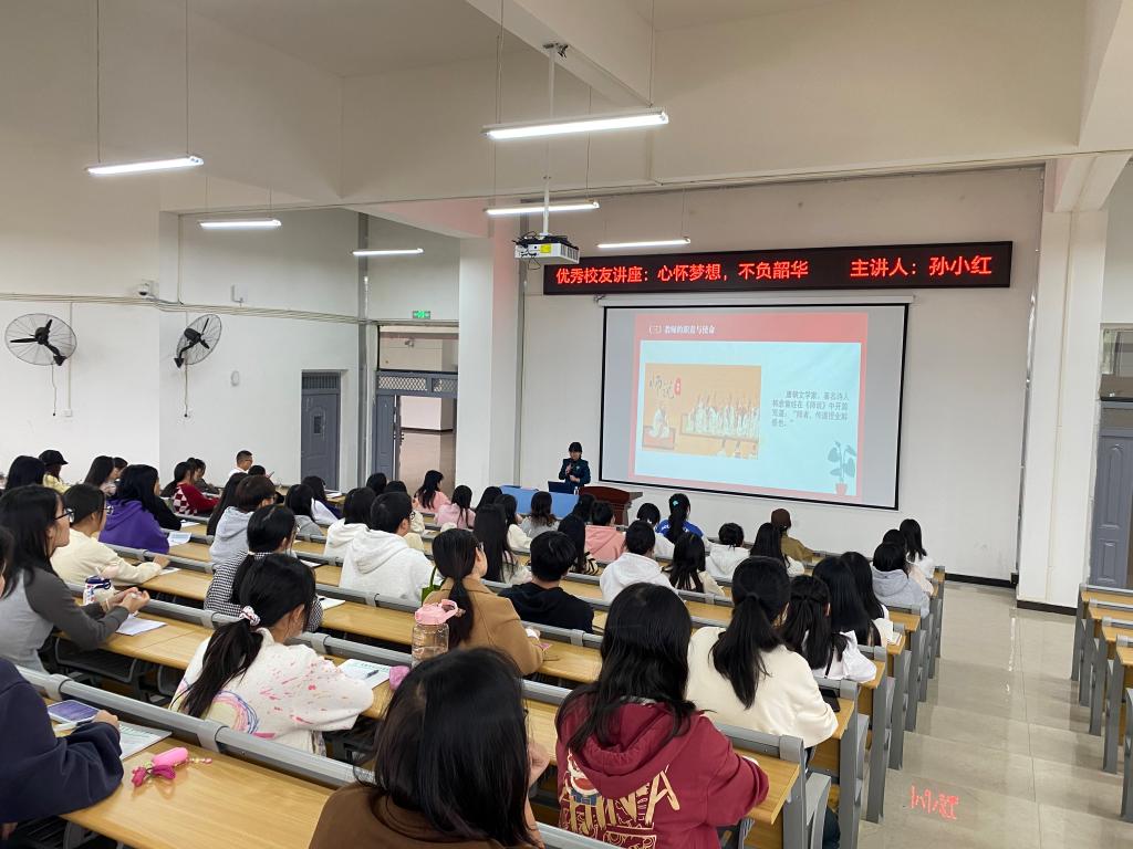 孙小红以自己的成长经历为例,为学生传授宝贵的学习工作经验。她从“何为教师”“我的老师”“我的教师之路”三个角度娓娓道来,鼓励在座的学弟学妹们努力学习。孙小红从哲学经典三问引出“认识自己”的主题,希望大家学会感恩、努力拼搏、不断提升自我。最后,她寄语学生:期待你们早日加入教师队伍,播撒希望的种子,收获幸福人生!