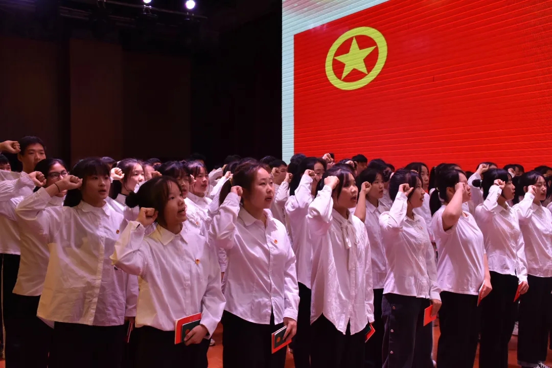 随后,入团仪式(九环节)在雄壮的国歌声中拉开序幕,在张印华及各二级学院团总支书记为新团员颁发团章、团员证并佩戴团徽等环节后,来自艺术与设计学院的邓佳玲作为2020年度业余团校优秀学员代表发言,她号召广大青年团员要争做先锋表率,认真学习党团知识,顺应时代发展潮流,并期待新一届学员能够在此次培训中学有所得、学有所用,至此开班典礼顺利落幕。