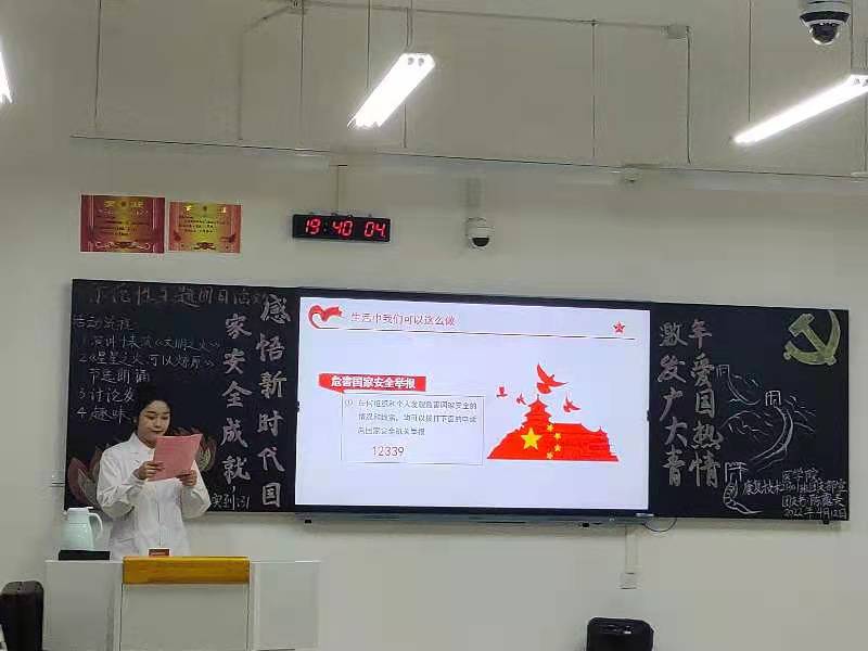 本次活动分为四个环节。首先同学们用豪情的团歌点燃了今夜,赵洪泽、龙双虹同学带来了《星星之火,可以燎原》节选朗诵,激励我们不忘初心、继续前进。接着由主持人童欣通过PPT的形式带领全班同学学习国家安全知识。随后是问答环节,主持人随机提问题,现场同学积极踊跃作答,现场气氛热烈。最后,由康复21301班的优秀同学展示拔火罐、艾灸等专业技能,鼓励大家学好专业知识,做好人民的健康卫士。