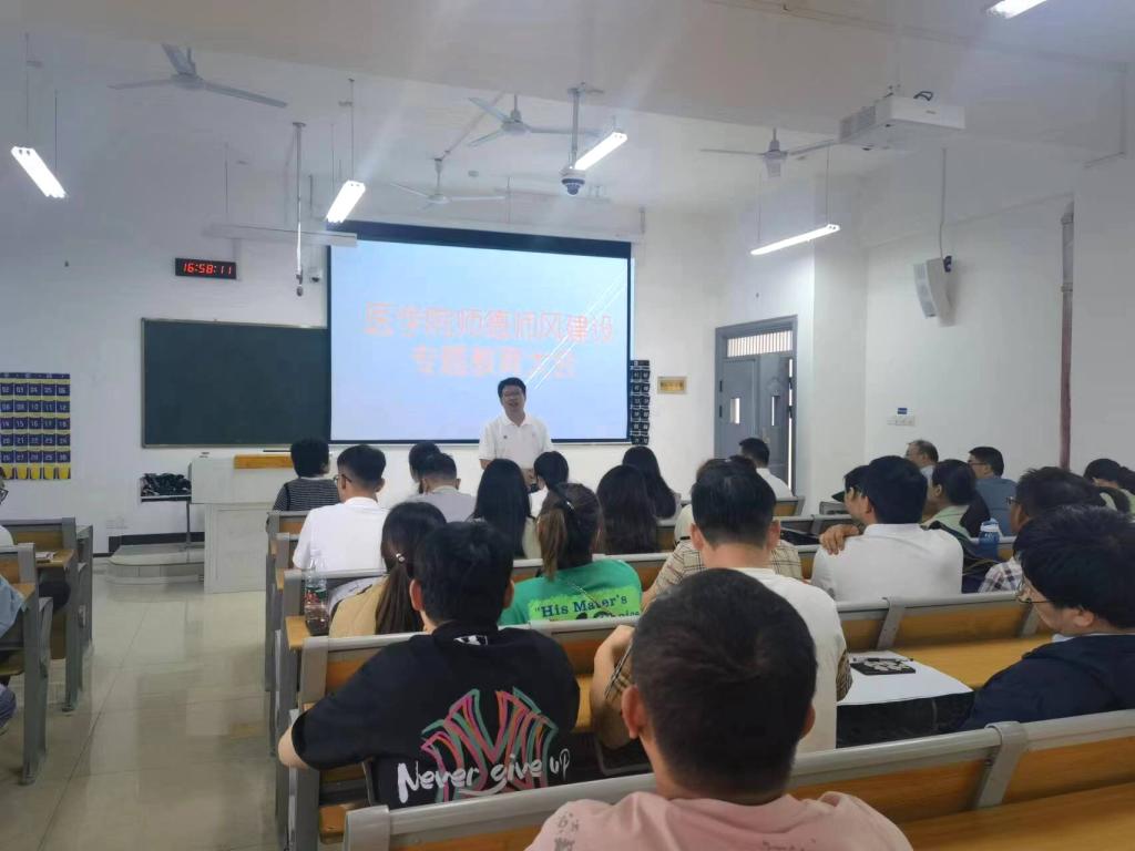 会议伊始,潘锋钢带领全体教师学习了党的二十大报告中关于师德师风建设的内容以及习近平总书记关于师德师风建设的重要论述。随后,潘锋钢结合七起师德师风违规行为典型案例进行专题教育,让广大教师从中汲取教训并引以为戒。他强调,教师队伍建设的第一任务是师德师风建设,全体教师要自觉提升思想政治水平、恪守职业道德,争做热爱教育、热爱学生、热爱教学的新时代“大先生”。