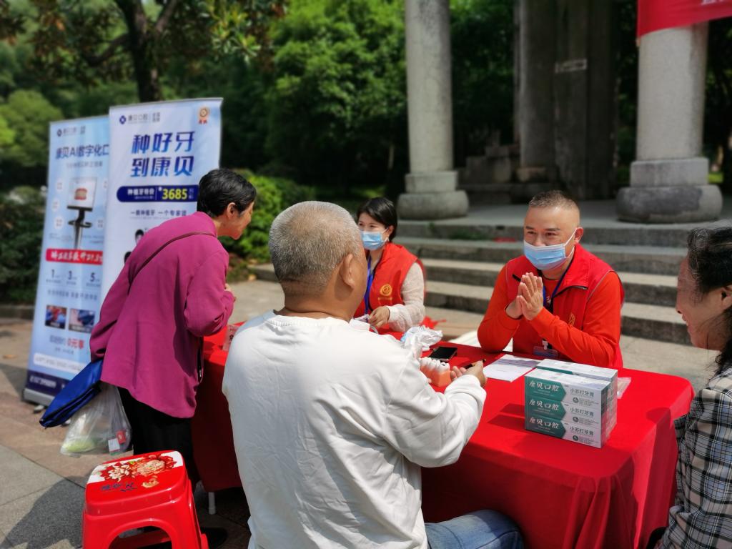 活动现场,医学院口腔专业师生和康贝口腔志愿者通过展板讲解、问答互动等方式,为到场群众讲解了日常牙齿保健、口腔疾病预防等知识,现场演示正确的刷牙方式,引导大家养成饭后漱口、每天早晚清洁口腔的良好习惯。随后,志愿者为前来咨询的居民免费进行了口腔检查和血压血糖测量等服务,并根据他们的口腔问题给出了针对性意见及治疗建议。